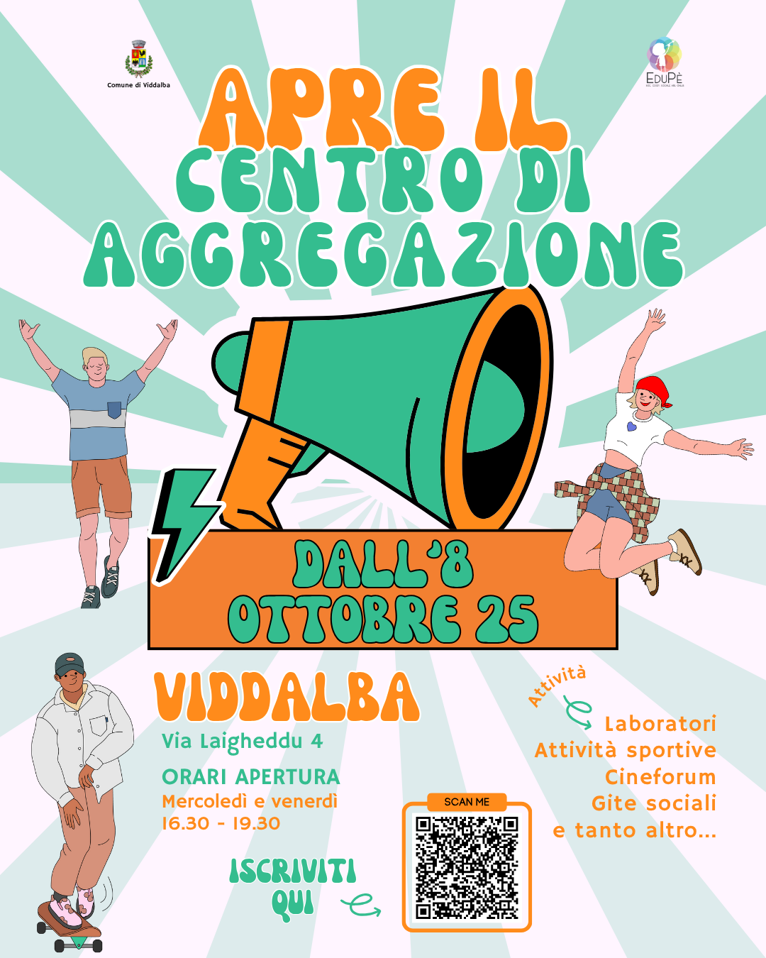 Si avvisano tutti i bambini e gli adolescenti di Viddalba che dal giorno 8 ottobre 2025 dalle ore 16.30 alle ore 19.30 riaprirà il Centro di Aggregazione Sociale sito in Via Laigheddu, 4